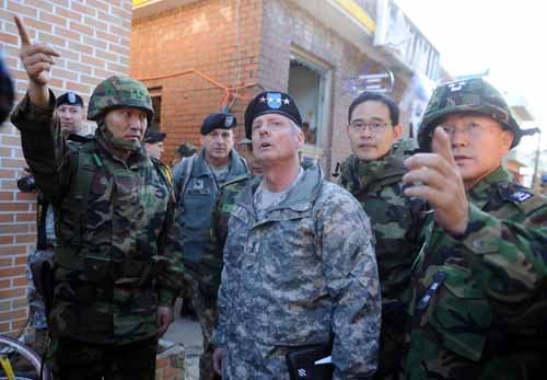 | ◇연평도 찾은 샤프 주한미군사령관 월터 샤프 주한미군사령관이 26일 연평도를 방문해 북한 포격 도발의 피해상황을 살펴보고 있다. 연합뉴스 |