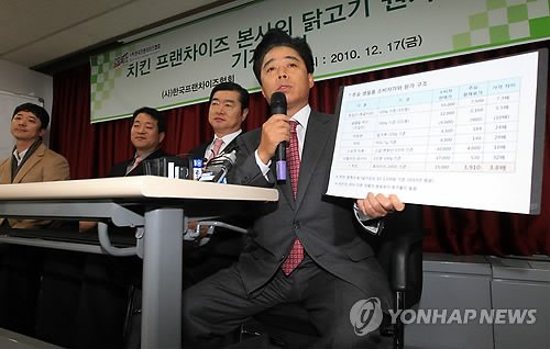 한국프랜차이즈협회는 17일 오후 광진구 능동 사무실에서 기자회견을 열어 "치킨 프랜차이즈 본사가 1㎏짜리 치킨 제품을 가맹점에 공급함으로써 남는 원재료 마진은 1천300원가량"이라며 "가맹점은 물론이고 본사가 폭리를 취하는 게 아니다"라고 주장했다.