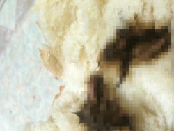 이 사진에는 쥐로 보이는 물체가 빵 속에 들어있으며, 털과 뼈 등이 그대로 드러나 있다.