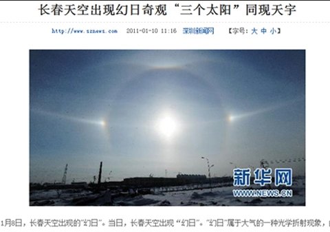 중국의 신화통신은 8일 장춘시 하늘에서 환일현상이 목격됐다고 보도했다. 환일현상은 태양이 3개로 보이는 것으로, 희귀한 현상이기 때문에 과거에는 이를 두고 지구 멸망의 징조로 해석했다.