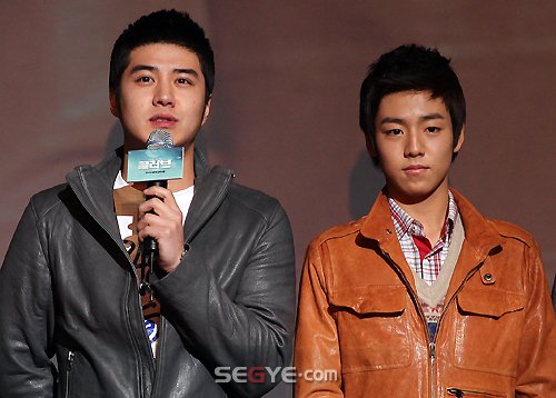 14일 오후 서울 광장동 멜론 악스홀에서 열린 영화 '글러브' 콘서트 시사회에 참석한 배우 장기범(왼쪽부터), 이현우가 관객들에게 인사말을 하고 있다.