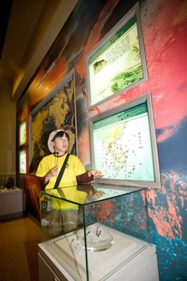 | ◇‘어린이 도슨트’로 활동중인 김지유(12)양이 서울 서대문자연사박물관에서 한반도의 지진 분포도를 설명하고 있다. |