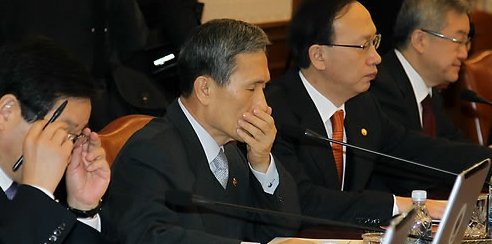 | 아덴만 여명작전을 성공적으로 마무리한 김관진 국방부장관이 25일 서울 세종로 정부중앙청사에서 열린 국무회의에서 입을 막고 있다. 김 장관은 전날 국회 국방위 간담회에서 의원들로부터 군작전 보안사항이 너무 알려졌다며 지적을 받았다. |
