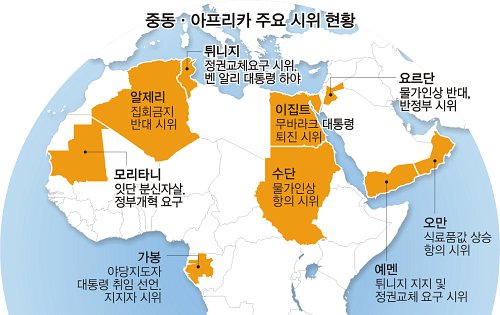 반정부 시위가 일고 있는 국가 대부분은 1인 장기 집권체제 하에서 국민이 빈곤과 부정부패에 시달려 왔다. 튀니지 ‘재스민 혁명’에 자극을 받은 인접 국가의 국민은 거리로 뛰쳐나와 그동안 참았던 울분을 터뜨리고 있다.