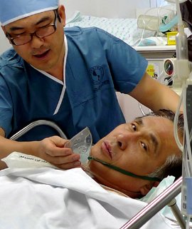 | ◇삼호주얼리호 석해균 선장이 일시 의식을 회복했던 3일 오전 경기도 수원 아주대 병원에서 눈을 뜨고 의료진의 진료를 받고 있다. 그러나 석 선장은 인공호흡기를 떼고 자가호흡을 한 지 18시간 만에 급성호흡부전증으로 다시 호흡기를 부착했다. 아주대학교 제공 |