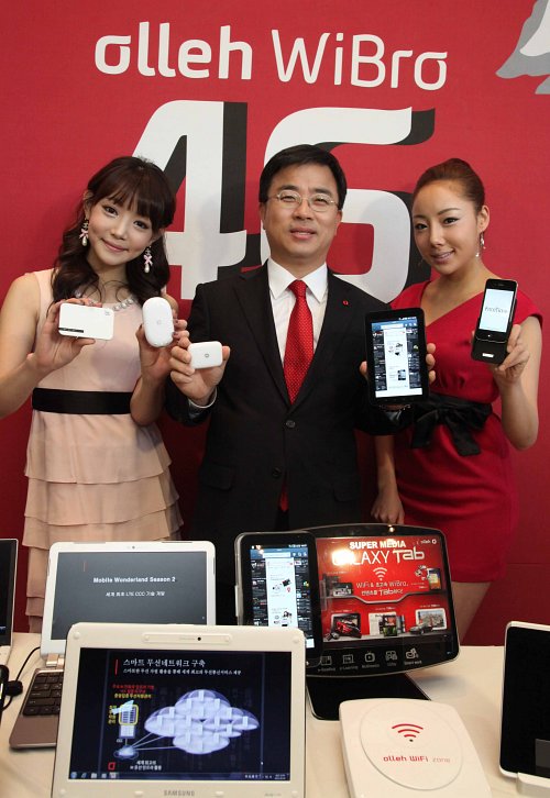 KT가 세계 최초로 4세대(4G) 와이브로 전국망 서비스에 나선 가운데 2일 서울 세종로 KT 올레스퀘어에서 KT 개인고객 부문 표현명 사장(가운데)이 모델들과 와이브로로 사용 가능한 갤럭시탭과 스마트폰을 들고 시연하고 있다.