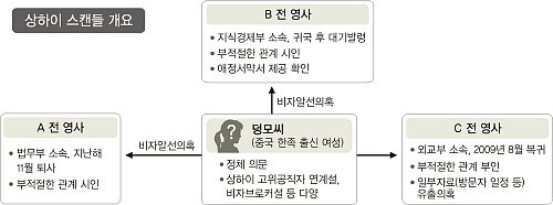 2009년 8월 비자 영사로 상하이에 파견된 법무부 소속 H 전 영사는 덩씨를 만나면서 내연관계로 발전했다. 이 과정에서 덩씨에게 비자를 이중발급한 사실도 확인됐다. H 전 영사는 지난해 11월 법무부로 소환됐다가 올해 초 사직했다.