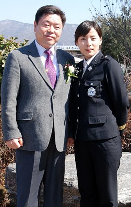 | ◇유지영(28·여·소방간부16기·오른쪽)씨가 지난 3일 천안 동남구 유량동 중앙소방학교 졸업식에서 아버지 유춘희(55·소방간부5기)씨와 기념촬영을 하고 있다. 경기소방재난본부 제공 |