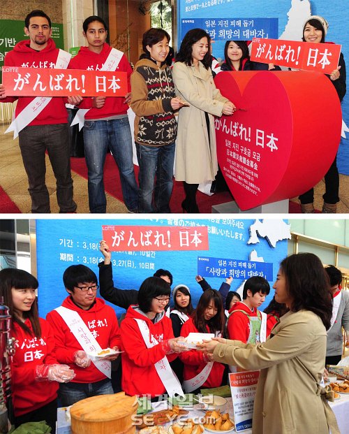 20일 서울 소공동 롯데백화점 본점에서 일본 대지진 피해를 돕기 위한 '사랑과 희망의 대바자' 행사에서 한국외국어대학교 소속 봉사단체 한국, 중국, 일본 학생들이 모금활동을 하고 있다.