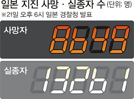 가족 잃고 대피생활에 상처…日정부 ‘부활청’ 신설 검토 지진·해일로 피해를 본 일본 도호쿠(東北) 지방에 대한 구조작업이 막바지에 이른 가운데 재해를 겪은 어린이들이 트라우마(외상후 스트레스)에 시달릴 것으로 우려된다. 일본 정부는 활발한 복구 작업 지원을 위해 ‘부흥청’ 신설을 검토하고 있다. 일본 대지진 11일째인 21일, 사망·실종자는 총 2만1000명을 넘어섰다.