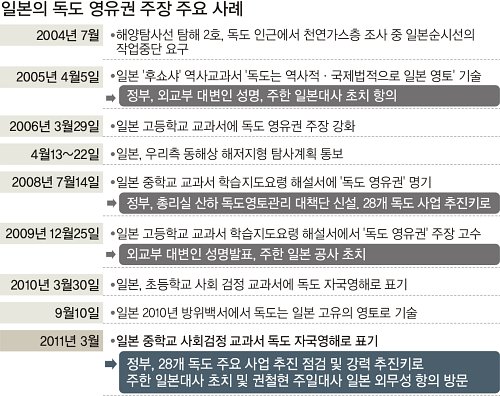 우려스러운 것은 일본이 한국 정부가 행하는 주한 일본 대사관 관계자 초치와 외교부 대변인 성명 등을 귓등으로 흘려듣는다는 점이다. 우리가 일본의 독도 영유권 주장을 연례 행사처럼 받아들이듯 일본 역시 한국의 항의를 관행으로 치부한다는 얘기다. 이는 일본 정부의 주장이 매년 강화되는 데서도 잘 드러난다.