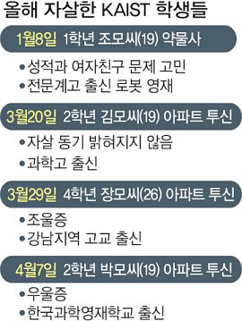 올 들어서만 4명의 학생이 자살한 대전 카이스트(KAIST) 교정에는 8일 침묵만이 흐르고 있었다. 캠퍼스의 학생들은 말을 잃었고 얼굴빛은 어두웠다. 캠퍼스에 봄은 찾아왔지만 학생들 마음은 아직도 찬바람이 불고 있었다.