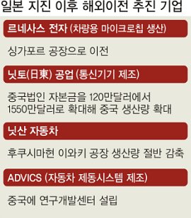 일본 경제력의 상징인 제조업체들이 대지진과 방사능 누출 사태에 놀라 일본 내 생산시설을 해외로 이전하는 작업을 서두르고 있다.