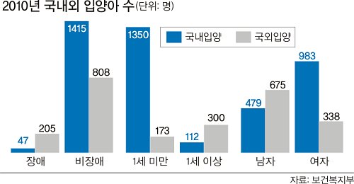 10일 보건복지부에 따르면, 지난해 국내입양 아동 1462명 중 만 1세 이상 ‘연장아동’ 비율은 7.6%(112명)에 그쳤고, 장애아동 비율도 전체의 3.2%(47명)에 불과했다. 양부모들이 연장아동은 친자식과 같은 관계형성이 쉽지 않다거나 장애아동은 양육 과정이 곱절 힘들 것으로 여기는 경향 때문으로 분석된다. 반면 같은 기간 해외입양 아동 1013명 중 연장아동과 장애아동 비율은 각각 30%(300명)와 20.2%(205명)에 달했다.