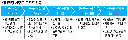 두 시간 넘게 진통을 거듭한 끝에 결국 신주류는 ‘대표 권한대행’이라는 간판을 얻고, 구주류는 비대위를 인정받는 수준에서 타협점을 찾았다. 협상 과정에 대해 황 원내대표는 “내가 타협안을 제시했고 정 위원장이 즉각 받았다”고 소개했다. 그는 원내대표가 비대위에 참석하지 않는 것에 대해 “통상의 당무는 비대위가 하라고 결정한 최고위원회의 결정을 존중한다”며 “대신 이견이나 난제가 있으면 매주 중진회의에서 논의할 것”이라고 말했다.