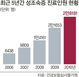13일 건강보험심사평가원에 따르면 성조숙증 진료환자는 2006년 6438명에서 2008년 1만4161명, 2010년 2만8181명으로 최근 5년 사이 4.4배 정도 늘어났다. 연평균 진료환자 수 증가율 또한 44.9%에 달했다.