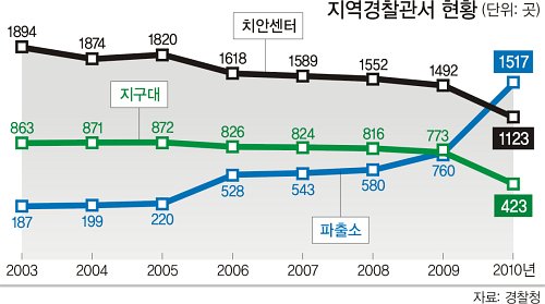 이에 대해 경찰청 관계자는 “(단기적으로) 지난해 하반기부터 신도시 조성 등 급한 상황이 아니면 인력, 예산을 먼저 확보한 뒤 파출소로 전환하는 원칙을 세우고 있다”며 “(중장기적으로) 인력과 예산을 늘릴 방침”이라고 말했다.