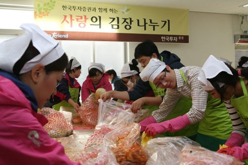 | 한국투자증권 임직원들이 지난해 11월 독거 노인을 위한 ‘사랑의 김장나눔’ 행사에서 김장을 담그느라 여념이 없다. |