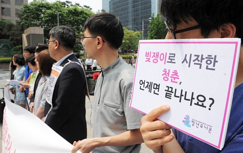 21세기 한국대학생연합과 등록금넷이 7일 서울 청계광장에서 경찰의 반값등록금 촛불집회 불허 방침에 항의하고 있다. 지차수 선임기자 |