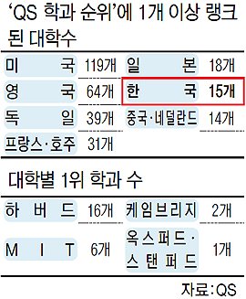 영국의 대학평가기관 QS의 학과별 세계대학 평가에서 한국의 학과들은 대부분 50위권 밖에 머물렀다. 그나마 이공계열이 좋은 평가를 받았지만 인문학은 하위권이었다.