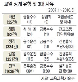 10일 교육과학기술부의 ‘교원 징계 실태 및 판례 분석’ 관련 보고서에 따르면 2007년 1월∼2010년 6월 각급 학교에서 각종 비위 사실로 징계 및 불이익처분이 내려진 건수는 2649건이었다. 이중 중징계에 해당하는 파면과 해임, 정직은 각각 35건, 82건, 334건이었고 경징계에 해당하는 감봉은 351건, 견책은 1038건이었다.