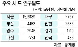 반면, 광주와 전남은 상반된 양상을 보였다. 광주의 인구밀도는 2000년 2698명에서 지난해 2946명으로 늘었고 전남은 167명에서 142명으로 줄었다.