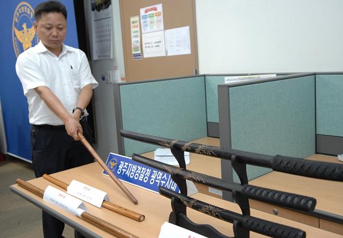| "세상에 이것으로 아이를 때리다니" 가출이 잦은 아들의 버릇을 고쳐달라는 어머니의 부탁을 받고 중학생(13)을 목검 등으로 때려 숨지게 한 특공무술 체유관 전직 관장과 사범 등이 경찰에 붙잡혔다. <연합> |