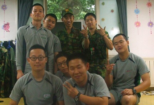 | 신병체험에 나선 이재형 소위(앞줄 맨 왼쪽)가 생활관에서 ‘선임병’들과 함께 사진을 찍고 있다. 육군 제공 |
