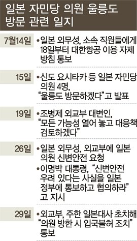 일본 제1야당인 자민당 지도부는 ‘영토에 관한 특명위원회’ 소속 신도 요시타카(新藤義孝) 중의원 의원 등 4명에 대한 울릉도 방문 중단 설득을 포기하고, 당의 파견 형식이 아닌 개인적 방문 형태로 용인하기로 했다고 현지 언론이 이날 보도했다. 이에 따라 신도 의원 일행은 다음달 1일 한국 김포공항으로 입국해 2일 울릉도를 방문한 뒤 4일 귀국할 예정이다.