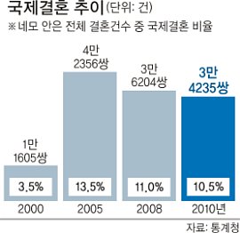 31일 통계청에 따르면 지난해 전체 결혼 32만6104건 가운데 외국인과 결혼한 건수가 3만4235건으로 전체 결혼의 10.5%를 차지했다. 국제결혼 건수는 2000년 1만1605건에서 2005년 4만2356건으로 5년 만에 4배 가까이 증가했다. 전체 결혼 가운데 국제결혼의 비율은 같은 기간 3.5%에서 13.5%까지 치솟았다. 이후 국제결혼이 연간 3만건대로 낮아지면서 국제결혼의 비중 역시 2006년 11.7%, 2007년 10.9%, 2008년 11.0%, 2009년 10.8% 등 하향 추세를 보였다.