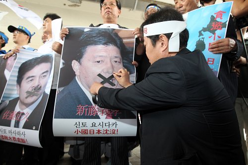 '日 자민당 의원 물러가라' 일본 자민당 의원들이 울릉도 방문을 위해 입국하기로 한 1일 오전 서울 김포공항에서 시민단체가 신도 요시타카 의원의 사진에 테이프를 붙이고 있다.