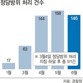 3일 경찰청에 따르면 지침 시행 전인 1월 17건에 불과하던 경찰의 정당방위 처리건수가 3월 63건, 4월 144건, 5월 158건, 6월 146건으로 증가했다. 지침 시행 4개월 동안 모두 511건이 정당방위로 처리된 것. 511건 가운데 203건은 입건조차 되지 않았다. 나머지 308건도 불기소처분으로 사건이 종료됐다. 경찰서로 사건이 넘겨지기 전 지구대나 파출소 등 지역경찰의 초동조치 단계에서 정당방위로 처리된 사례도 54건이나 됐다.