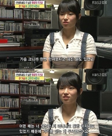 박은나 씨는 “사람들 시선이 부담스럽다. 멀리서 빤히 쳐다보는 사람도 있다”며 “어렸을 때 등교하는데 어떤 아저씨가 갑자기 오더니 가슴 크니까 한번 만져보자고 한 사람도 있었고 임신한 거 아니냐고 말한 아저씨도 있어서 거리를 걷는 게 무서웠다”고 고백했다.