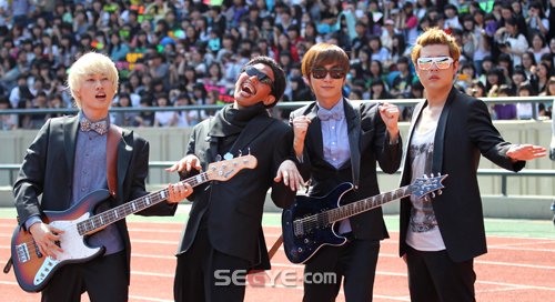 27일 오전 서울 송파구 잠실주경기장에서 열린 MBC 추석특집 프로그램 '제3회 아이돌스타육상선수권대회'녹화 현장공개에서 방송인 붐과 슈퍼주니어 이특, 신동, 은혁이 축하무대를 펼치고 있다.