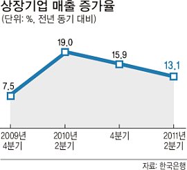 20일 한국은행이 지난달 17일부터 지난 14일까지 상장기업 1491개를 대상으로 분석한 ‘2분기 상장기업 경영분석’에 따르면 기업의 성장성을 보여주는 2분기 상장기업 매출액 증가율은 전년 같은 기간 대비 13.1%로 전분기(16.9%)보다 폭이 줄어들었다. 2009년 4분기 7.5% 이후 최저치다.