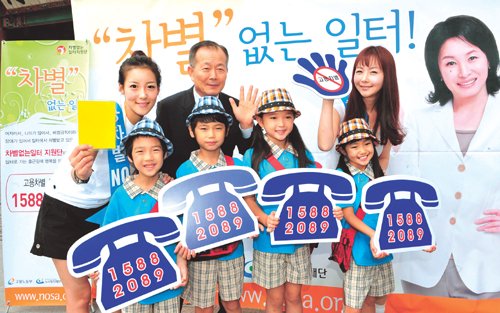 차별 없는 일터 지원단이 주최한 ‘고용차별 거리상담’행사에서 차별 없는 일터 마련을 홍보하는 퍼포먼스를 하고 있는 모습. 세계일보 자료사진 |
