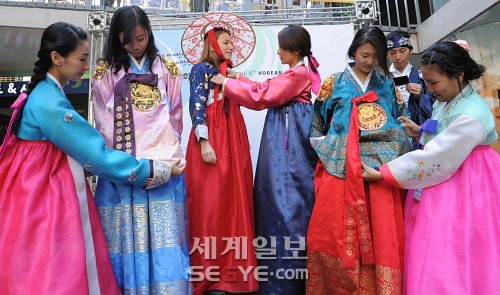 4일 서울 종로구 인사동 쌈지길에서 열린 세계한인의 날(10월 5일) 문화체험 행사에 참가한 외국인들이 관계자들의 도움을 받아 한복을 입고 있다.