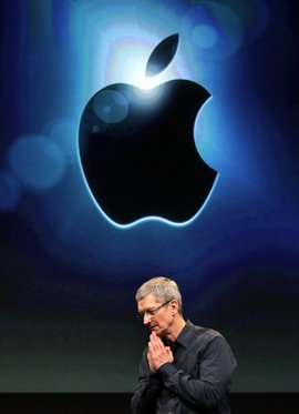 팀 쿡 애플 최고경영자(CEO)가 4일(현지시간) 미국 캘리포니아 애플 본사에서 신제품 아이폰4S를 소개하기에 앞서 기조연설을 하며 두 손을 모으고 있다.