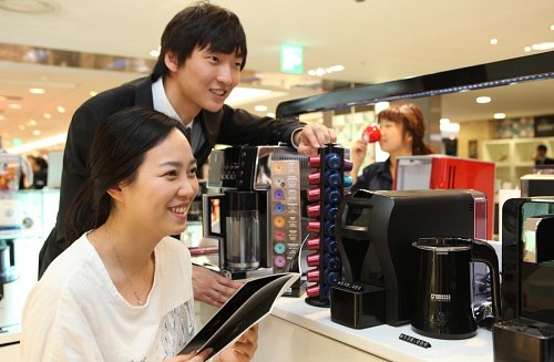 | 6일 롯데백화점 가전매장을 찾은 고객들이 ‘캡슐 커피 머신’을 살펴보고 있다. 롯데백화점 제공 |