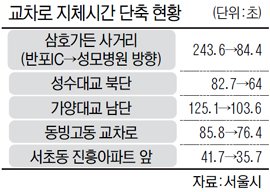 이 밖에 성수대교 북단 18.7초(82.7초→64초), 가양대교 남단 21.5초(125.1초→103.6초), 동빙고동 교차로 9.4초(85.8초→76.4초), 진흥아파트 앞 6초(41.7초→35.7초) 등 4개 지점 모두 지체시간이 줄었다.