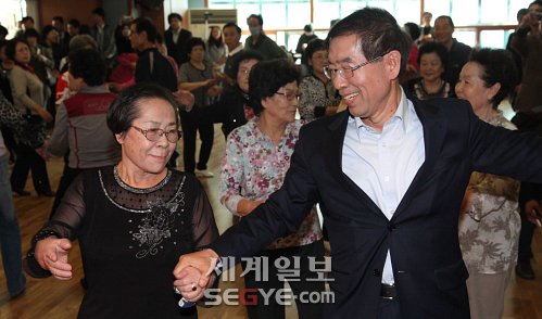 무소속 박원순 서울시장 후보(오른쪽)가 17일 서울 성북노인회관 댄스교실에서 한 노인과 짝을 맞춰 춤을 추고 있다. 지차수 선임기자 |