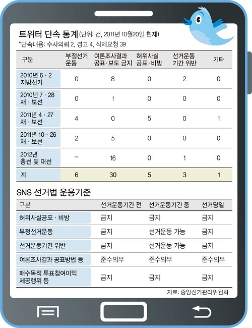 선관위가 SNS 이용이 보편화된 지난해부터 선거법 위반으로 트위터를 단속한 것은 20일 현재 모두 45건으로 집계됐다. 이 중 수사의뢰까지 간 2건은 투표당일 특정 정당과 후보자 성명에 기표한 투표지 사진을 트위터에 올린 것과 내년 총선 ‘낙선운동 대상자 명단’을 올린 것이 문제가 됐다.