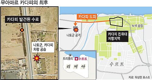 카다피가 경호원의 총에 맞아 숨졌다는 주장도 제기됐다. 당시 현장에 있었다고 밝힌 한 시민군은 “카다피 경호원 중 한 명이 카다피의 가슴에 총을 쐈다”고 말했다. 카다피가 생포되지 않도록 쐈다는 것이다.