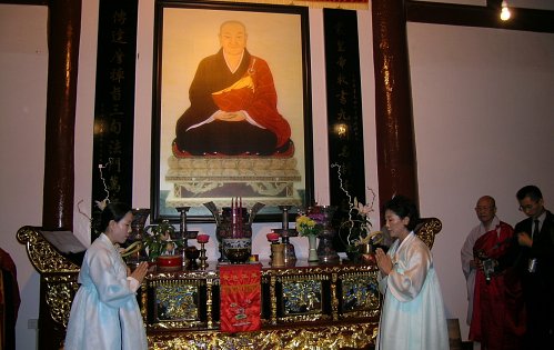 | 중국 사천성 대자사에 모셔진 무상선사(無相禪師) 영정 앞에서 차를 올리는 한국의 차인들. |