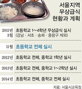 신임부교육감 성향 걸림돌 예고 우여곡절 끝에 1일부터 서울 초등학교 전 학년에 대해 전면 무상급식이 실시됐다. 당초보다 8개월 정도 늦어지긴 했지만 무상급식에 전향적인 박원순 서울시장의 당선으로 내년부터는 계획대로 실시될 것으로 보인다. 하지만 이주호 교육과학기술부 장관의 측근이 서울시부교육감에 임명되면서 무상급식이 차질을 빚을 가능성도 없지 않다.