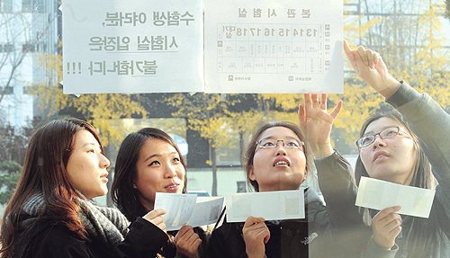 지난해 예비소집일에 서울 종로구 풍문여고 고사장을 찾은 수험생들이 고사실을 확인하고 있는 모습. 세계일보 자료사진 |