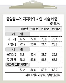 6일 기획재정부와 조세연구원 등에 따르면 지난해 기준으로 국민이 내는 세금 중 국세는 76.4%, 지방세는 23.6%다. 이는 국세가 76.7%, 지방세가 23.3%였던 2002년과 별 차이가 없다. 반면, 세출 비중을 보면 2002년 중앙정부는 42.5%, 지자체는 57.5%에서 지난해에는 36.3%와 63.7%로 지자체의 비중이 크게 늘었다.