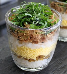 〈재료〉 찹쌀 1컵, 맵쌀 2컵, 스시초(식초, 설탕, 소금, 레몬즙 약간씩), 참치캔 1개, 쇠고기 200g, 깻잎 10장, 계란 2개, 올리브유 약간. 참치 양념(간장 2T, 설탕 1t, 통깨 약간, 소금 약간), 소고기 양념(간장 2T, 설탕 1t, 카레 2T, 다진 마늘 1t)