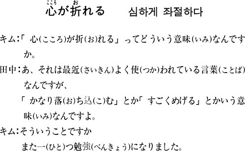 최근 ‘心(こころ)が折(お)れる’라는 표현을 자주 볼 수 있는데, 굉장히 실망하거나 자신감을 잃을 만한 일이 일어나 정신적, 육체적으로 기운이 나지 않은 상태를 말한다.