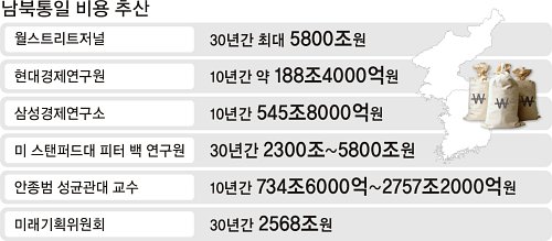 현대경제연구원은 지난 8월 연구보고서에서 통일비용이 10년간 약 1570억달러(약 188조4000억원)에 달할 것으로 추정했다. 북한 주민의 1인당 소득을 최소 3000달러 이상으로 끌어올리는 데 필요한 비용이다. 삼성경제연구소는 2015년 통일될 때를 가정해 남한의 최저 생계비 수준을 북한에 지원한다는 전제로 2025년까지 545조8000억원을 지원해야 한다고 추정했다. 미 스탠퍼드대 연구원 피터 백은 북한의 소득을 남한의 80% 수준까지 끌어올리기 위해서는 향후 30년간 2조∼5조달러(약 2300조∼5800조원)의 비용이 필요하다고 분석했다.